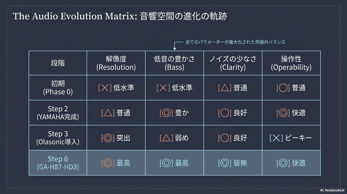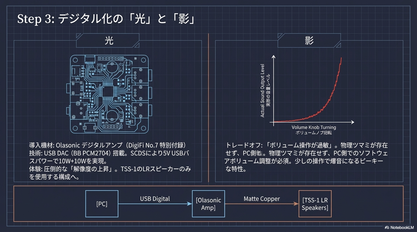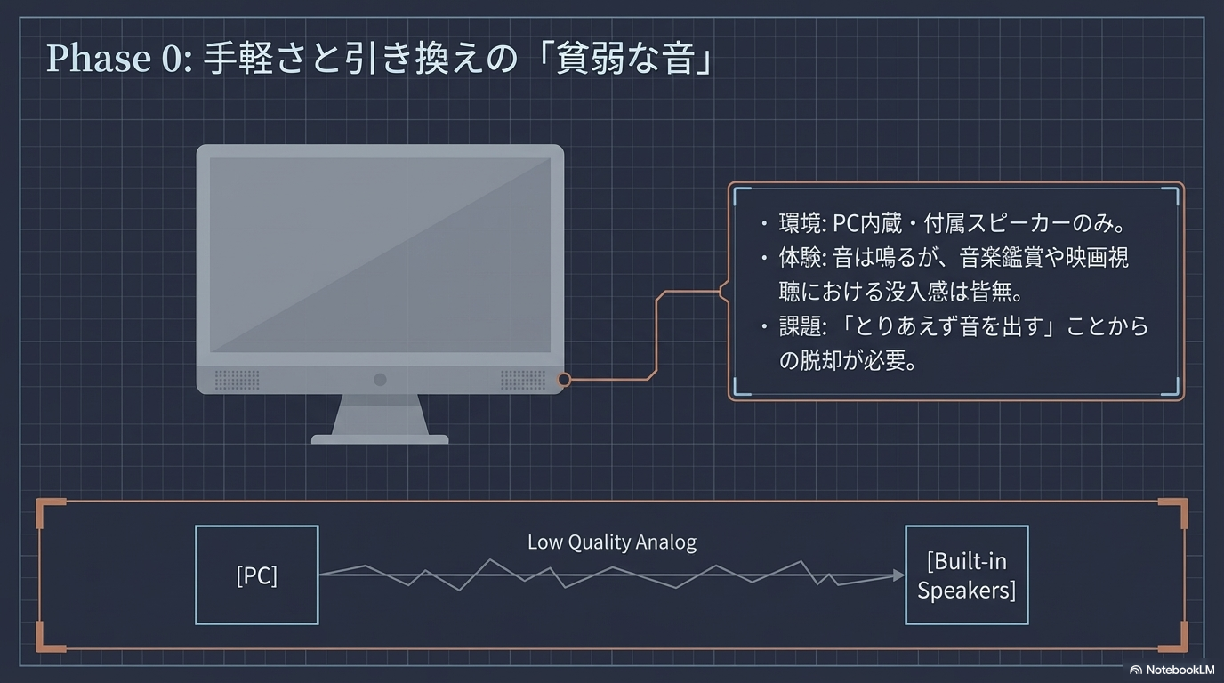 PCでの音楽鑑賞体験を向上させるため、10年?にわたり試行錯誤してきたオーディオ環境の変遷を記録しています。 アナログ接続からデジタル出力への移行、スピーカーの自作やリプレイスなど、音の解像度とノイズ対策を追求したプロセスです。