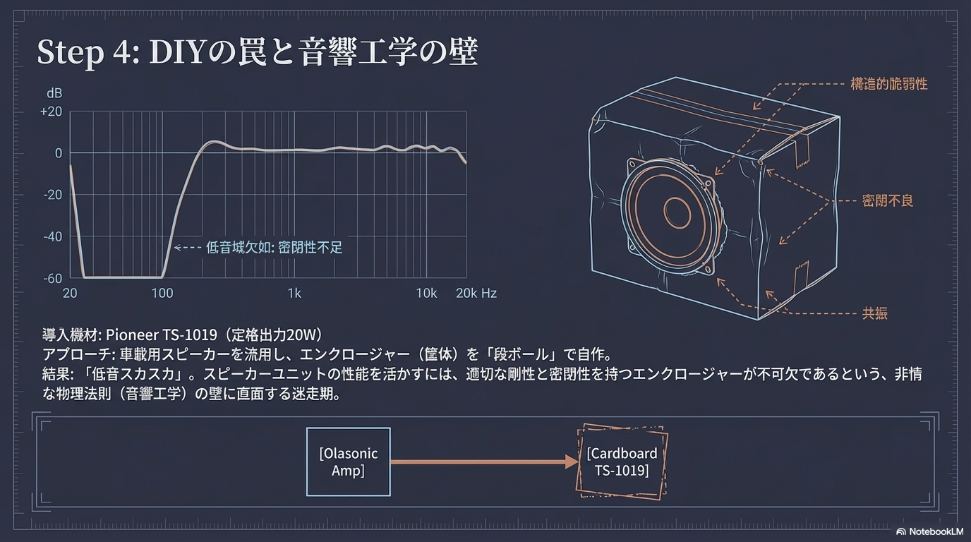 エンクロージャーはダンボールで自作であり低音スカスカ。